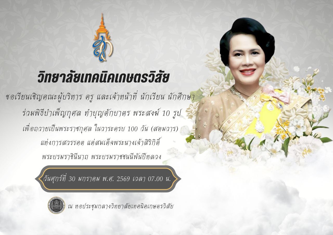 กิจกรรมทั่วไป ชาติ ศาสน์ กษัตริย์ ประชาสัมพันธ์ วิทยาลัยเทคเกษตรวิสัย เชิญร่วมพิธีบำเพ็ญกุศล ทำบุญตักบาตร เพื่อถวายพระราชกุศล สตมวาร (100 วัน) ถวายแด่สมเด็จพระนางเจ้าสิริกิติ์ พระบรมราชินีนาถ พระบรมราชชนนีพันปีหลวง 28 มกราคม 2026 Webmaster 0 Comments กิจกรรม, ข่าวทั่วไป, ชาติ ศาสน์ กษัตริย์